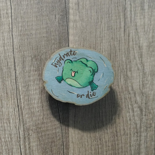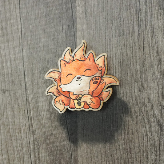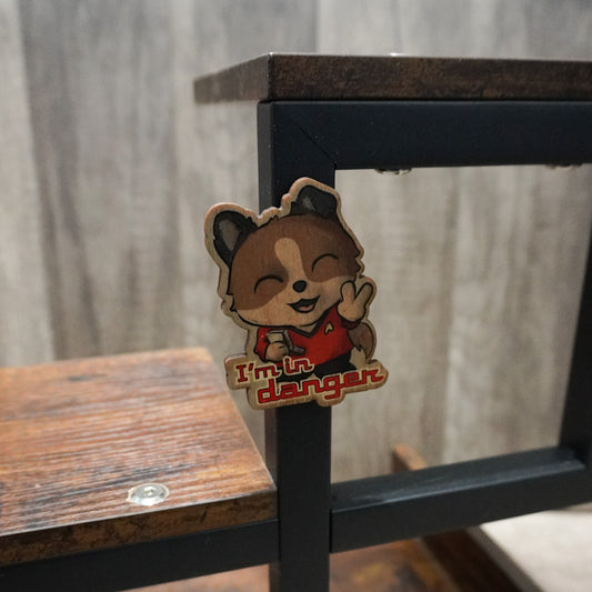 Constructed from birch and sublimation printed. Sized around 3 inches in the longest dimension and equipped with a 20 mm neodymium magnet.