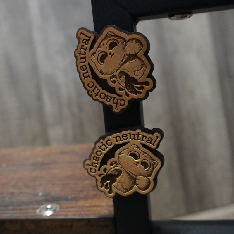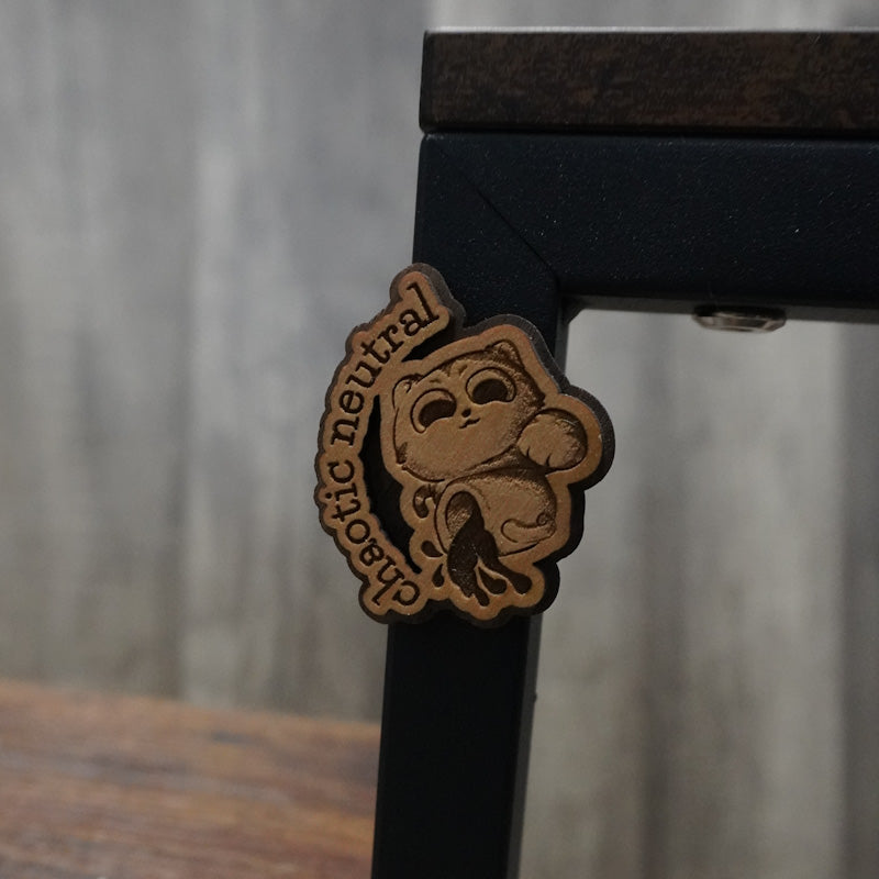 Constructed from various layers of 3mm walnut and alder wood. A 10mm neodymium magnet makes kitty stick to things.